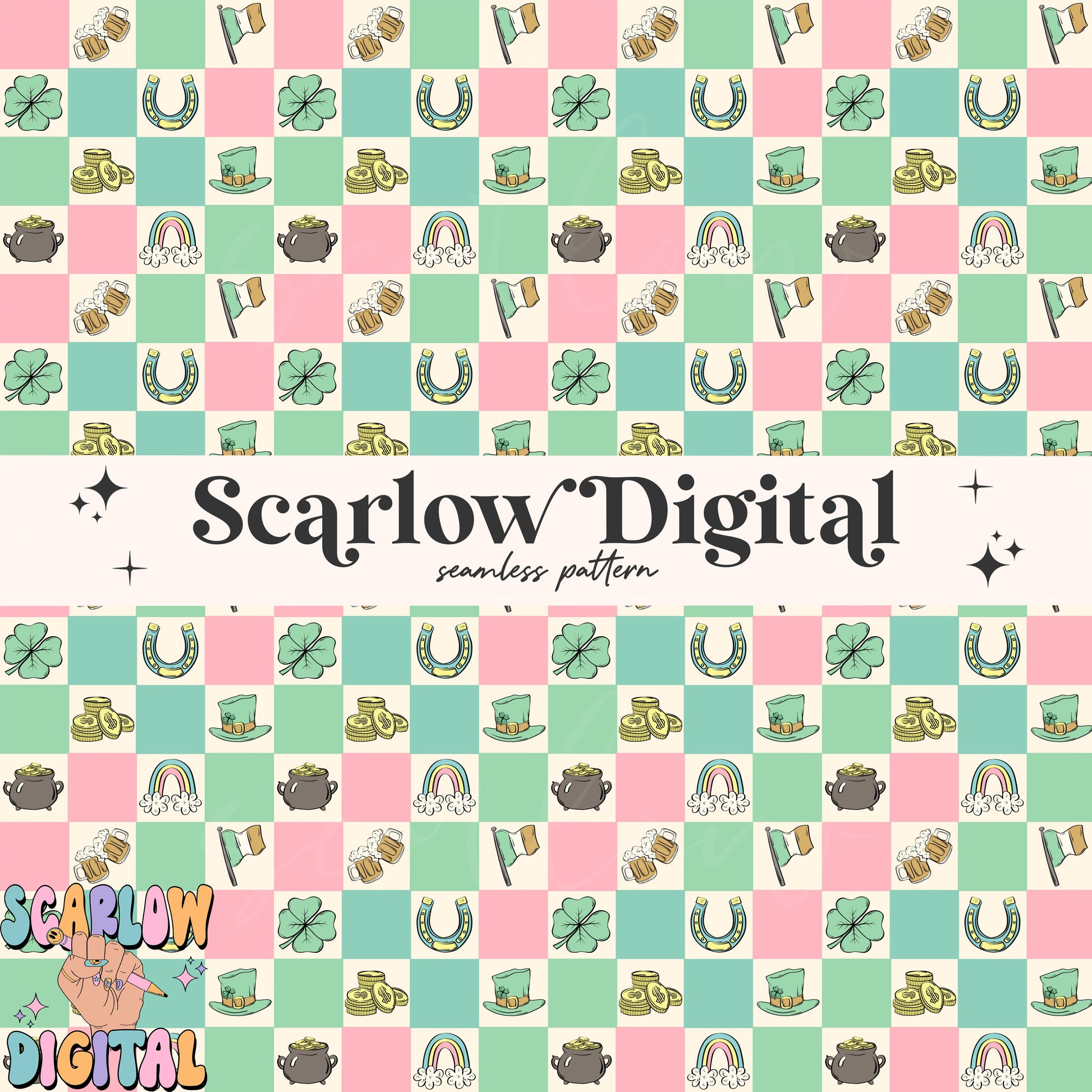 Checkered St Patrick's Day Doodles Seamless Pattern Sublimation Digital Design, rainbow seamless, pot of gold seamless, girl seamless files