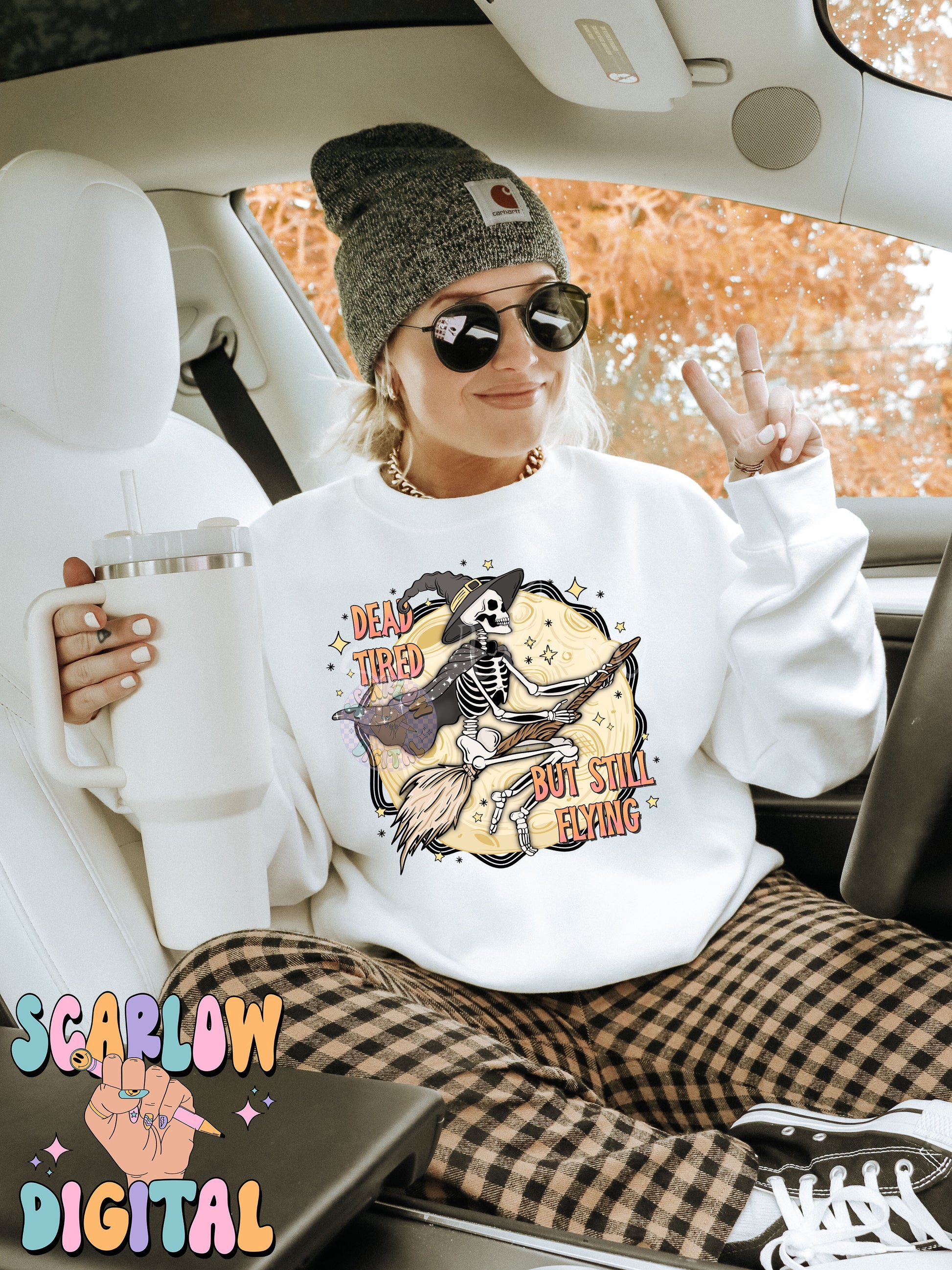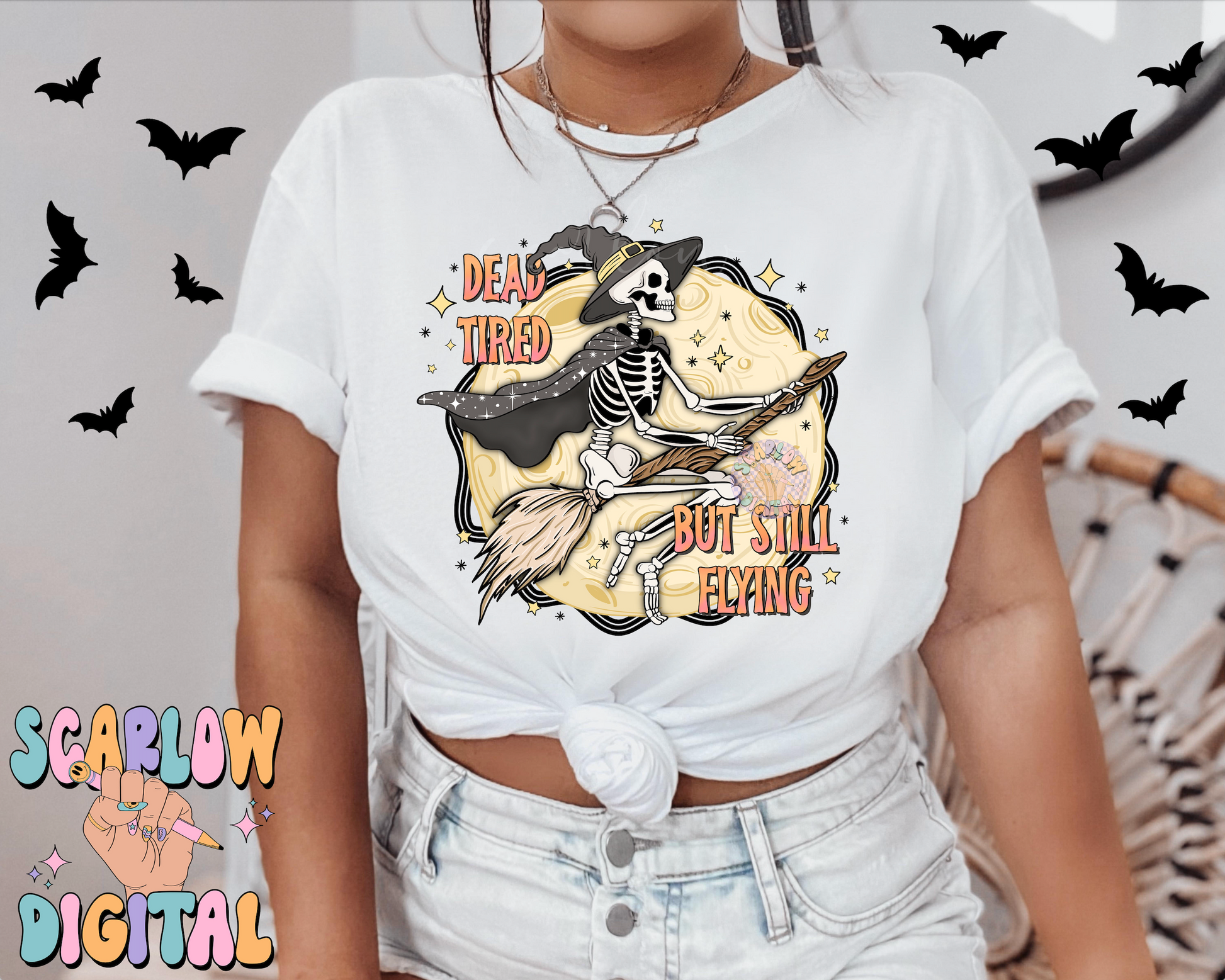 Dead Tired But Still Flying PNG Digital Design Download, Halloween png, skeleton png, funny png designs, adulting png, witch & full moon png