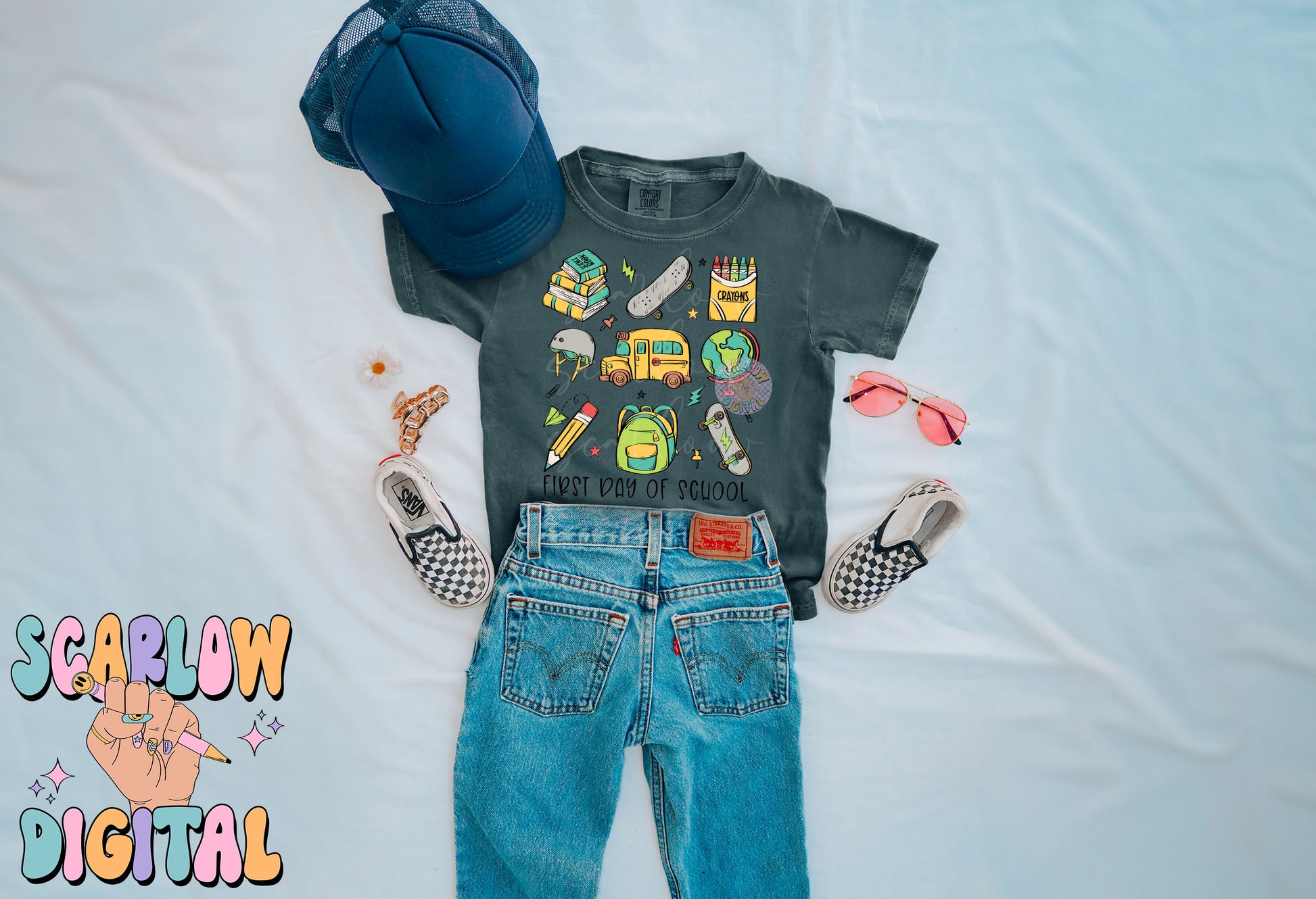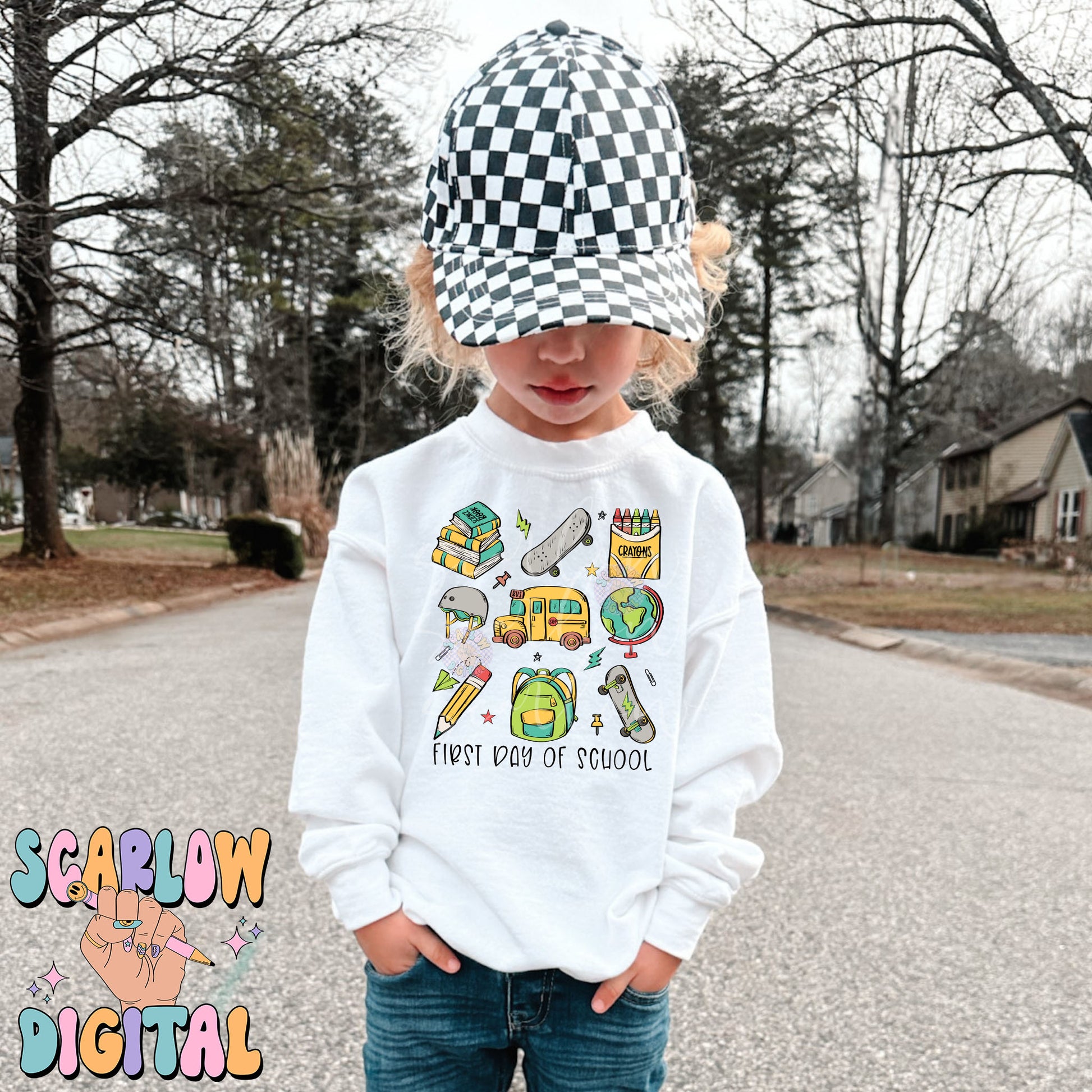 First Day of School PNG Digital Design Download, back to school png, kid png, skater boy png, books png, elementary school png, boy png