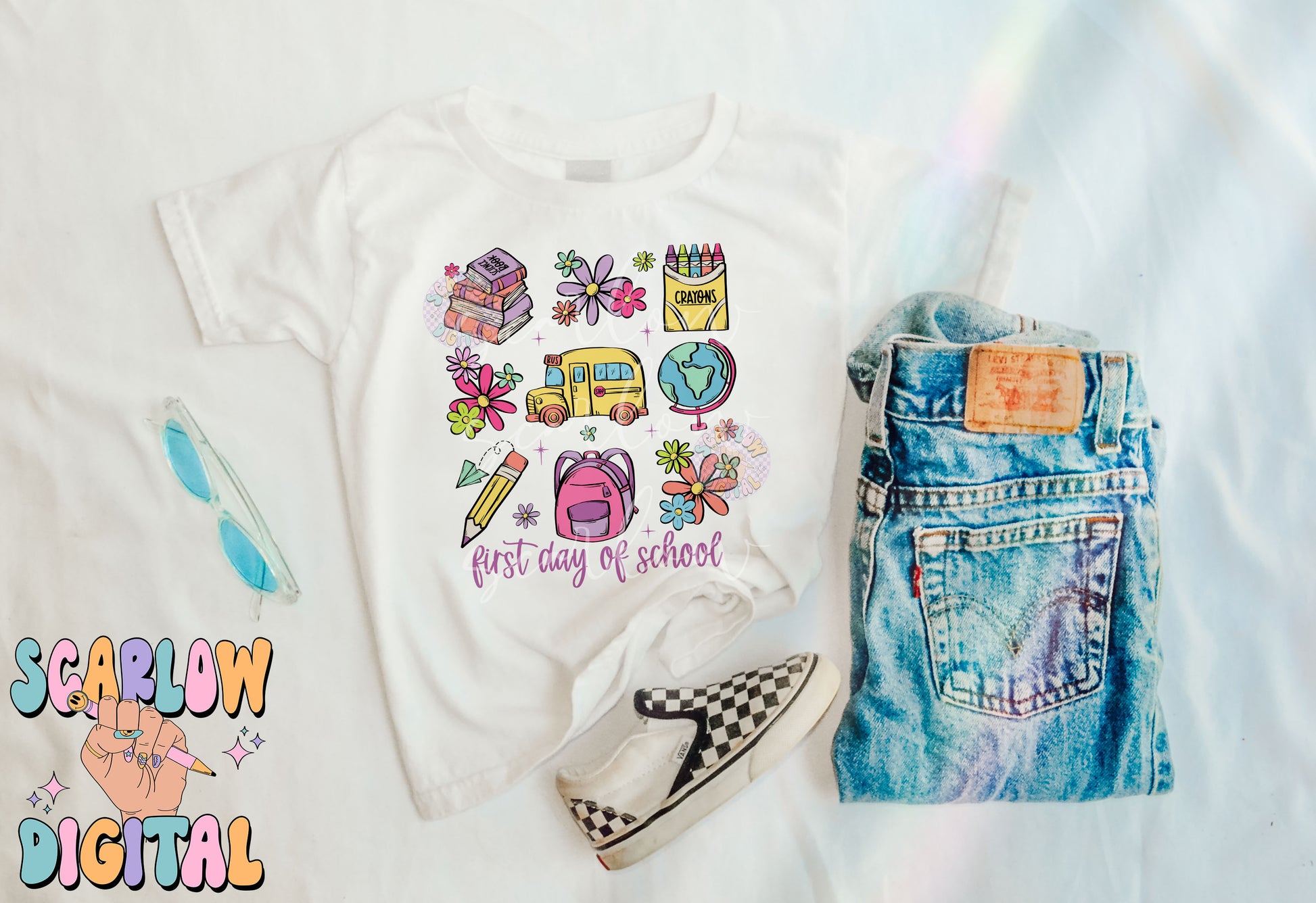 First Day of School PNG Digital Design Download, school bus png, books png, globe png, flowers png, girl school png, pencil png designs