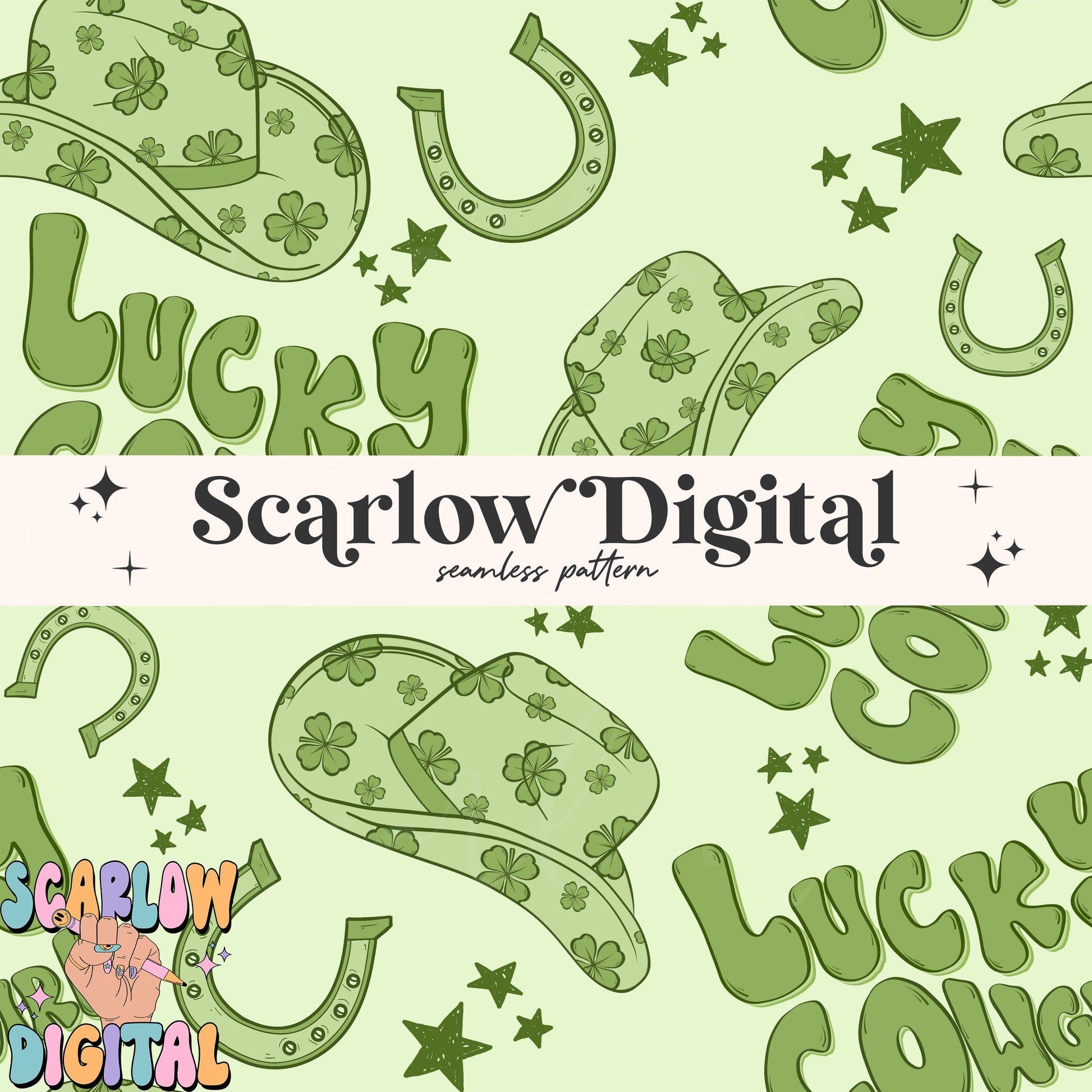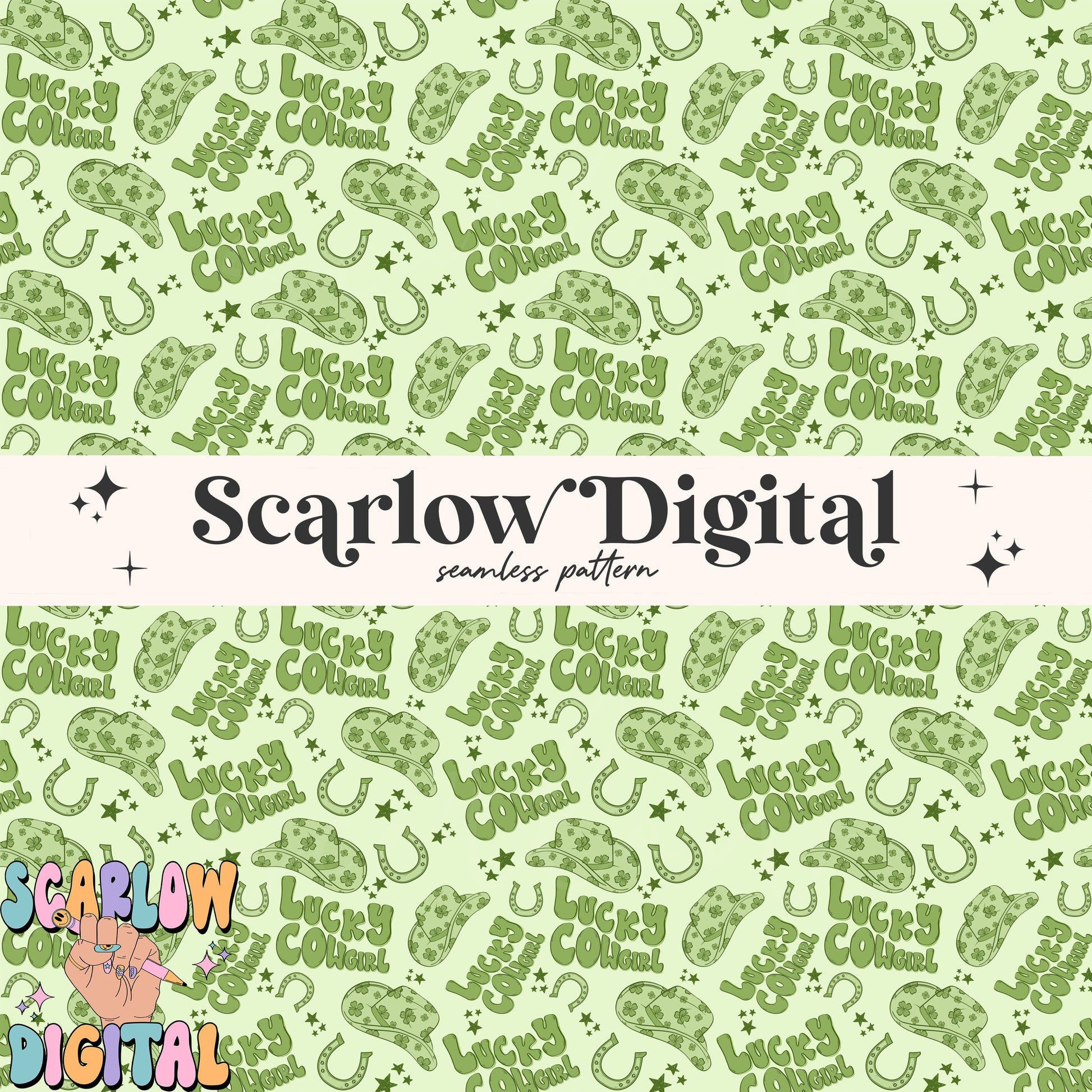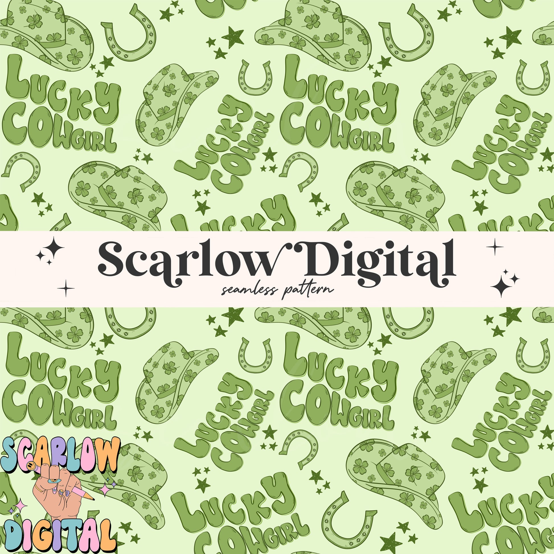 Lucky Cowgirl Seamless Pattern-St Patrick's Day Digital Design Download-shamrock seamless pattern, horseshoe seamless file, western seamless