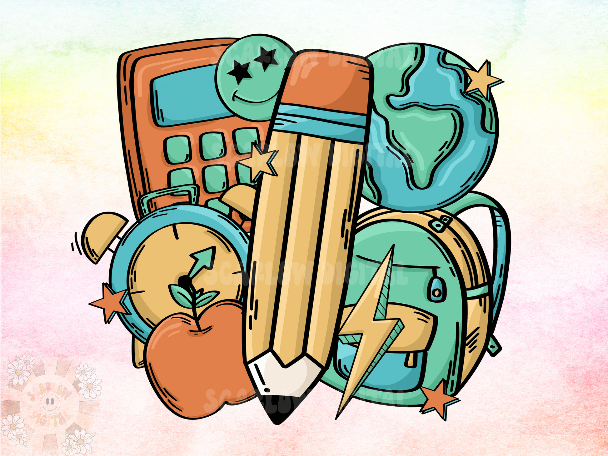 Retro School Doodles PNG-Back to School Sublimation Digital Design Download-pencil png, unisex school png design, apple png, teacher png