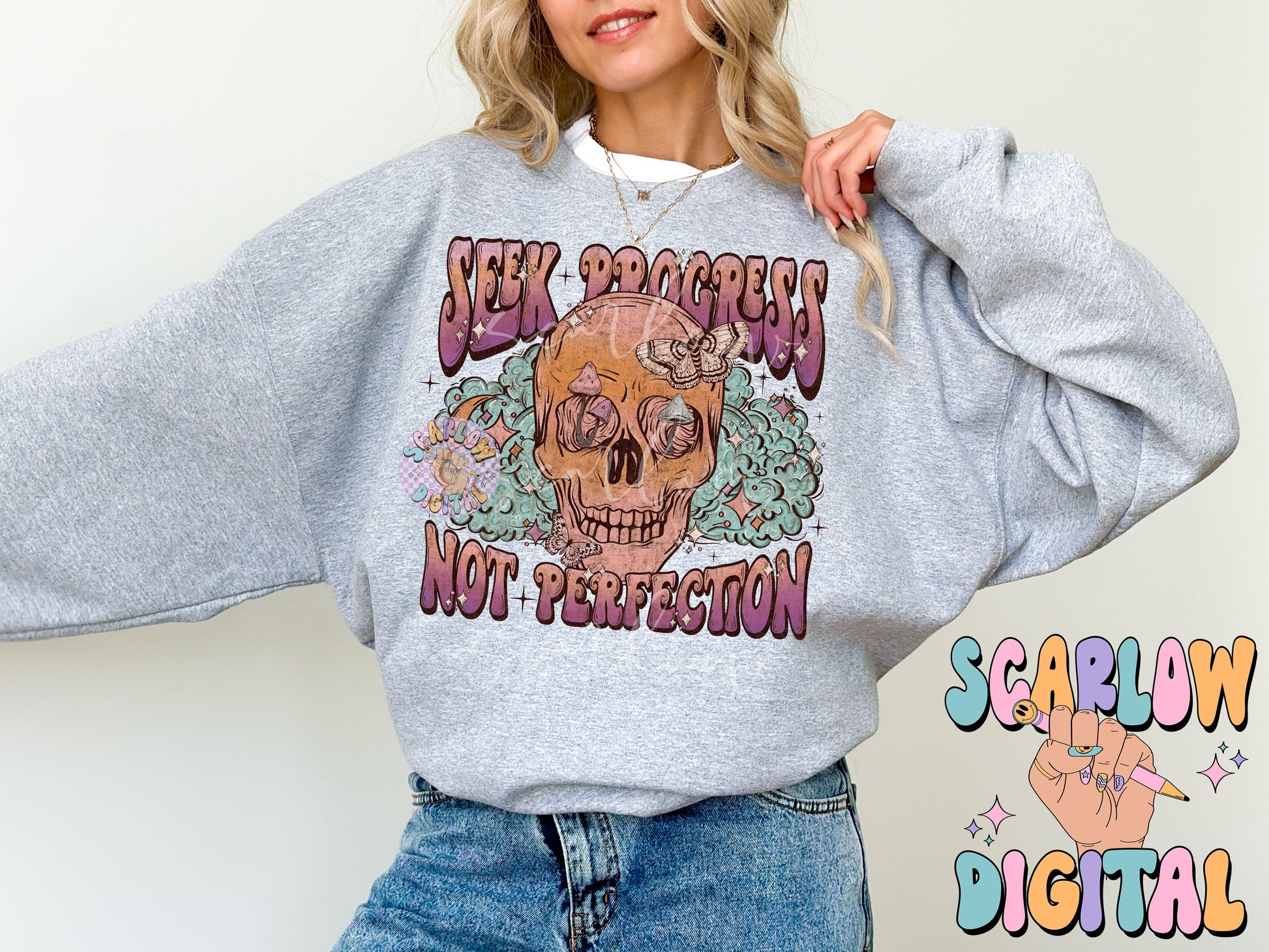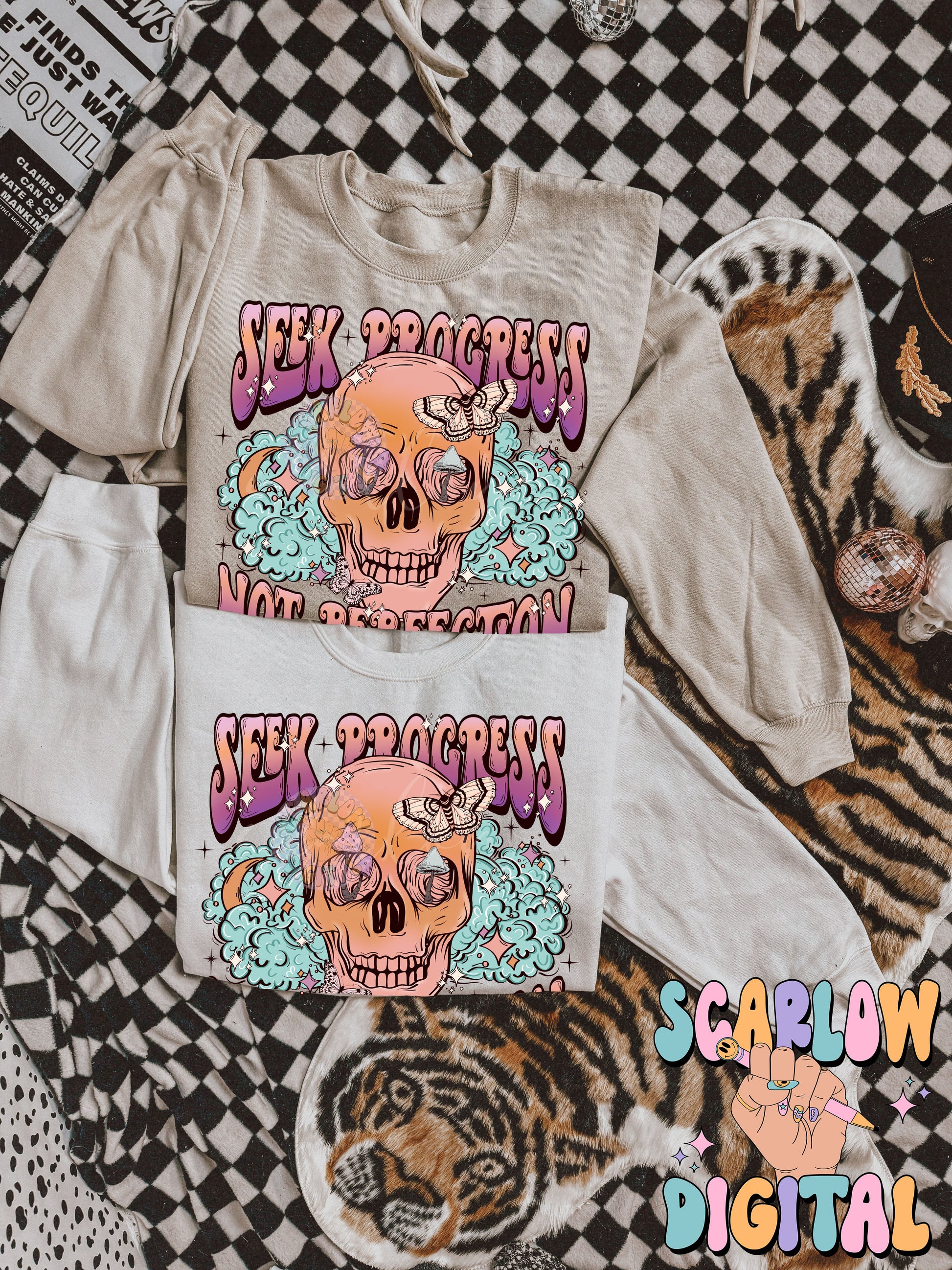Seek Progress Not Perfection PNG Digital Design Download, skull png, skeleton png, celestial png, self care png, butterfly png, mushroom png