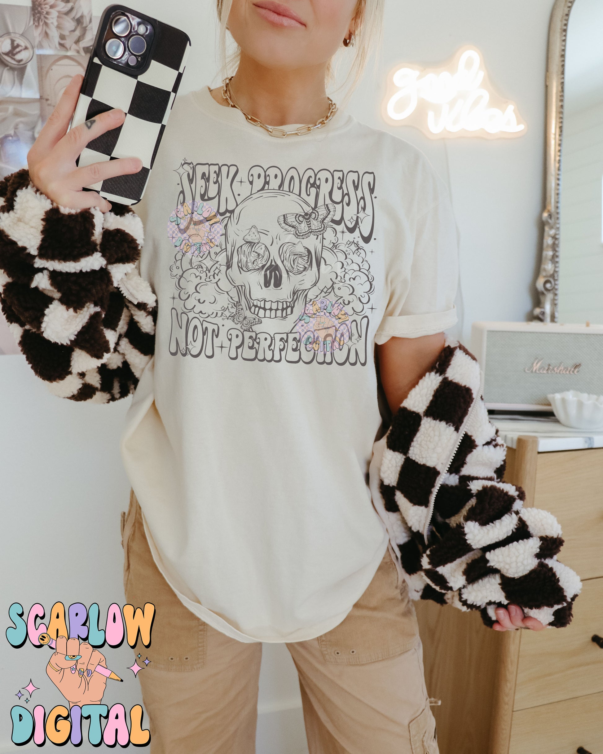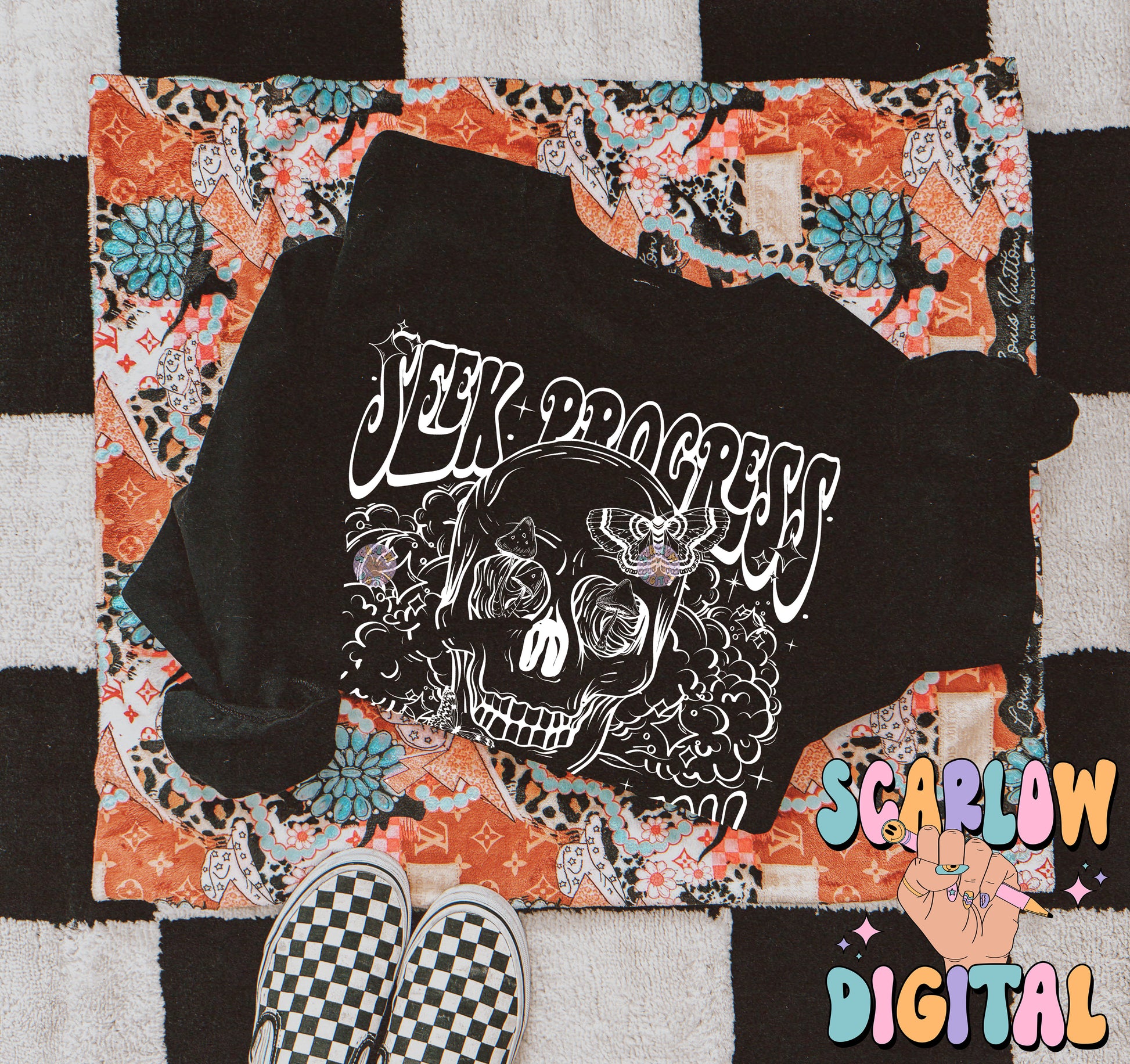 Seek Progress Not Perfection PNG Digital Design Download, skull png, skeleton png, celestial png, self care png, butterfly png, mushroom png