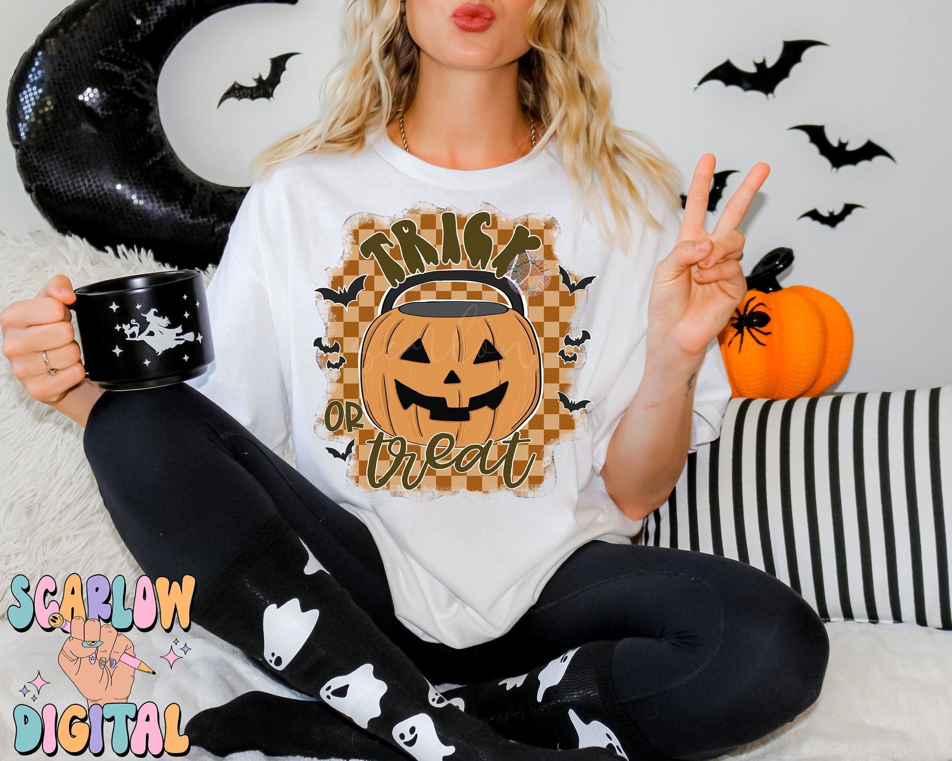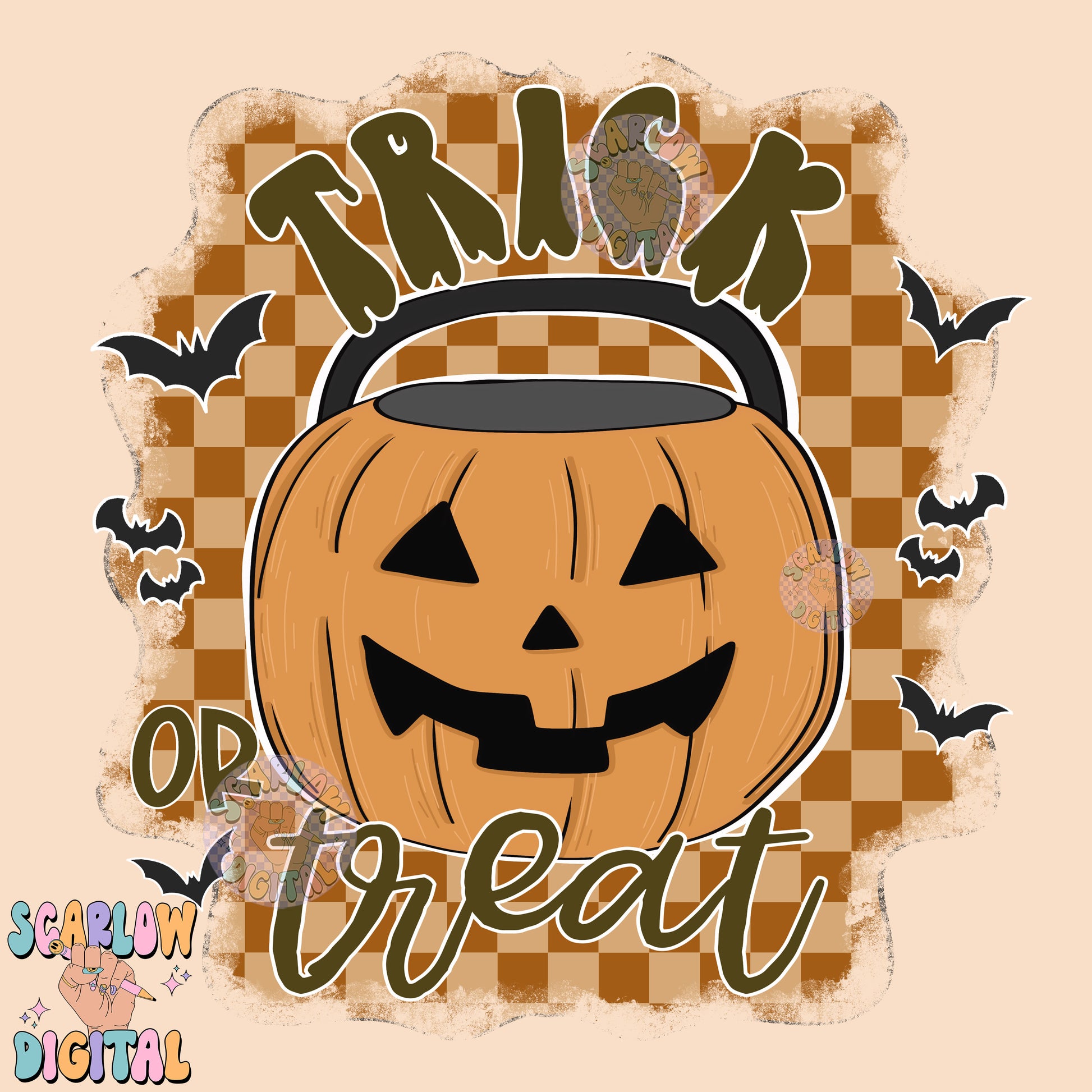 Trick or Treat PNG Digital Design Download, Halloween png, pumpkin bucket png, checkers png, spooky season png, bats png, fall png designs