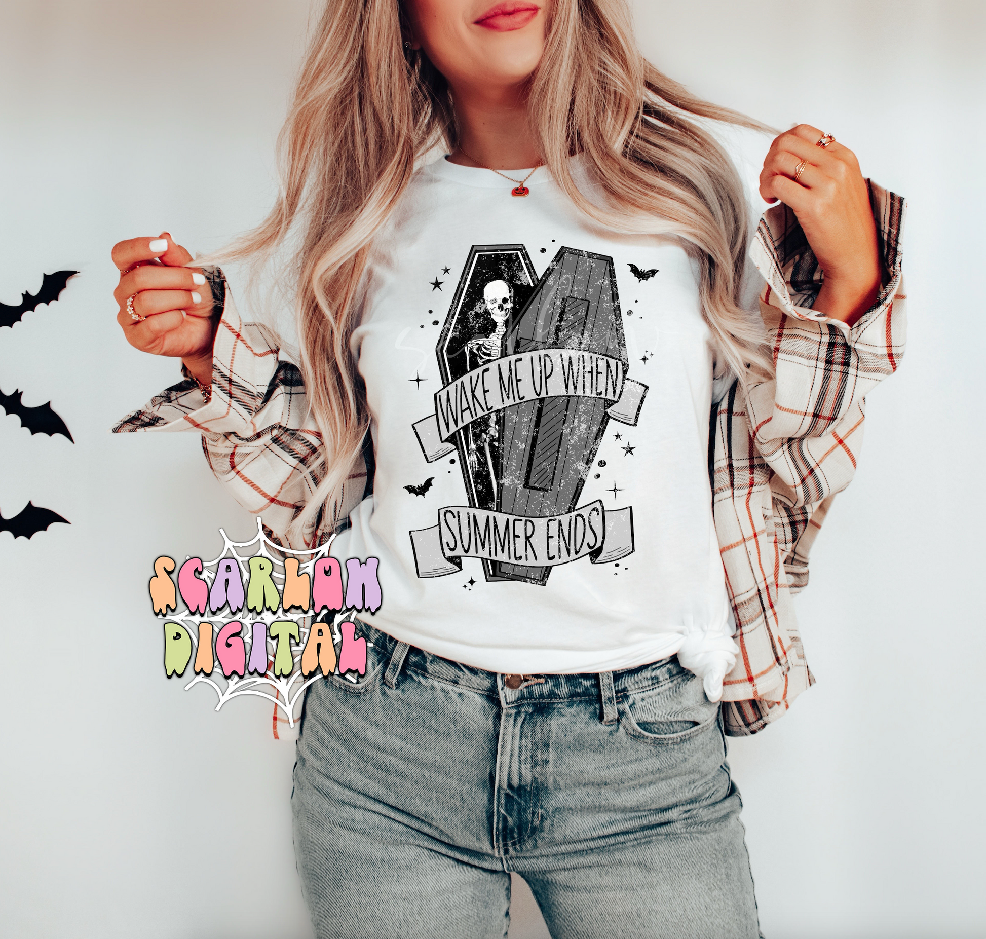 Wake Me Up When Summer Ends PNG-Halloween Sublimation Digital Design Download-skeleton png, coffin png, spooky png, black and grey halloween